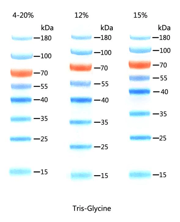 | 條帶分子量 (kDa) | 15, 25, 35, 40, 55, 70, 100, 180 | 10, 15, 25, 35, 40, 55, 70, 100, 150, 250 | 10, 15, 25, 35, 40, 55, 70, 100, 130, 180 | 10, 15, 25, 30, 35, 40, 55, 70, 80, 100, 150, 250 |