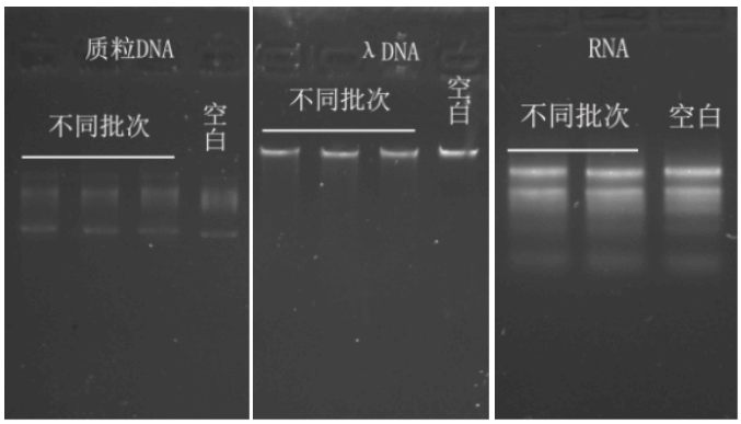 P1101與質粒DNA、λDNA、RNA共(gong)同孵育,瓊(qiong)脂糖(tang)凝膠電泳(yong)結果顯示質粒DNA、λDNA、RNA沒(mei)有明顯降解,表(biao)明P1101中沒(mei)有明顯的脫氧(yang)核(he)糖(tang)核(he)酸(suan)酶(mei)、核(he)糖(tang)核(he)酸(suan)酶(mei)殘留(liu)。