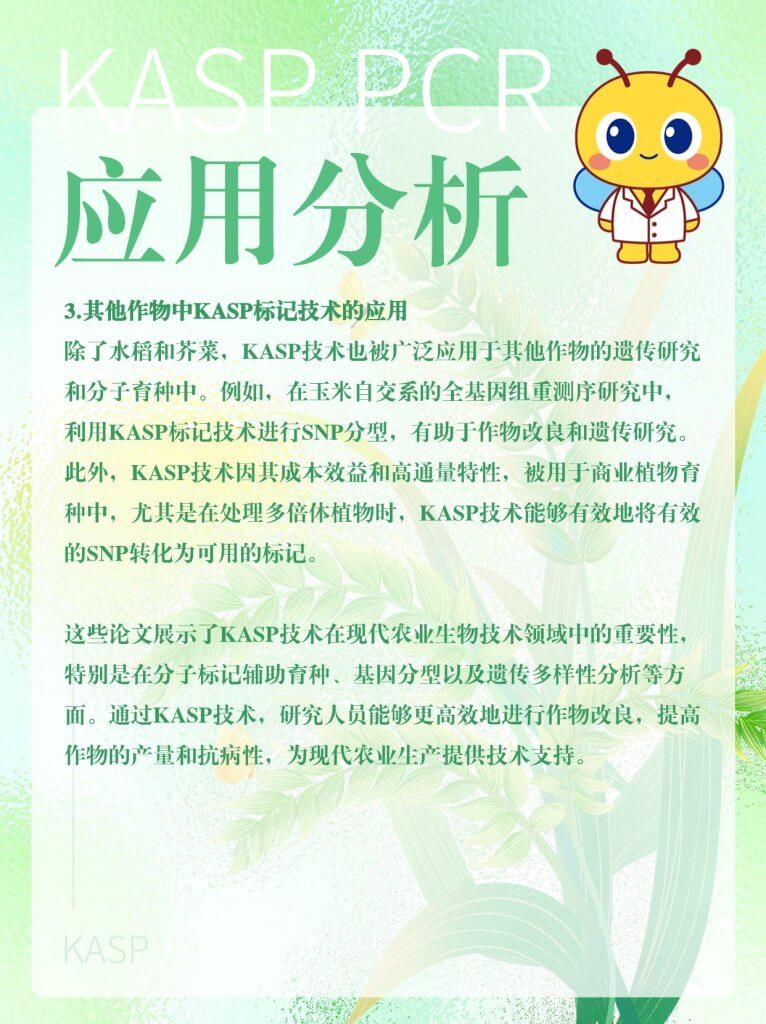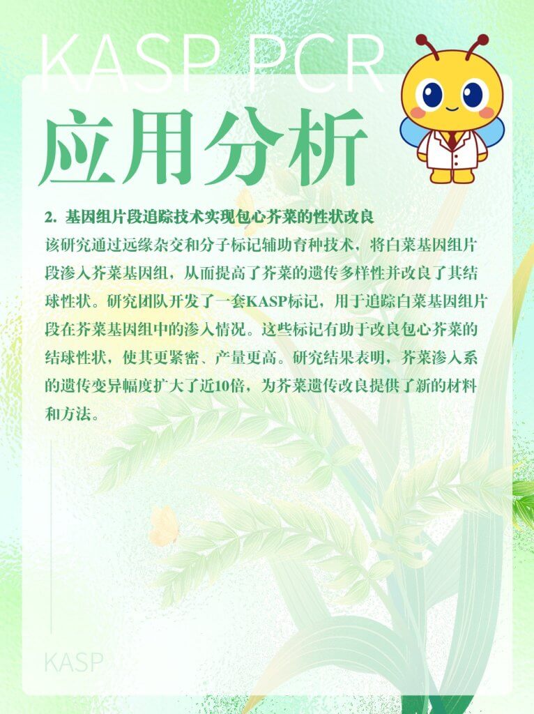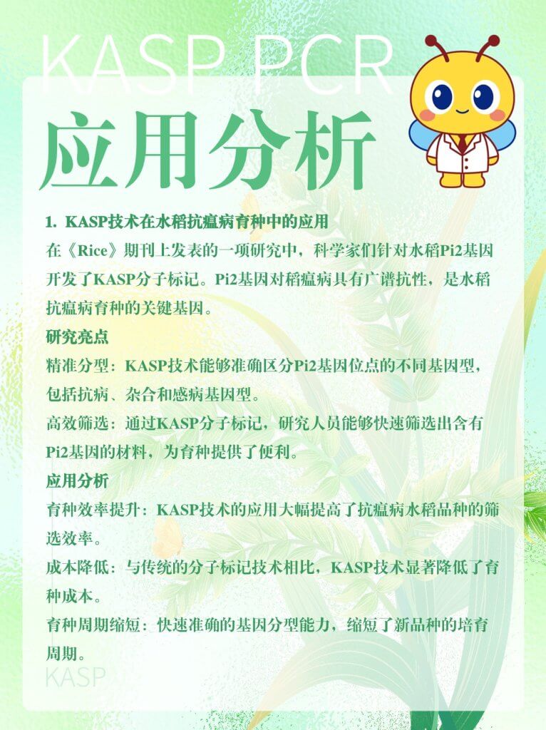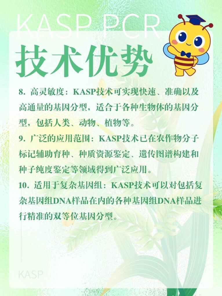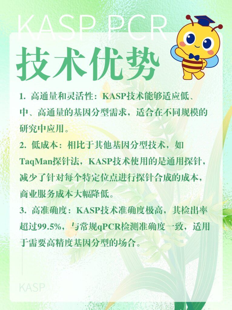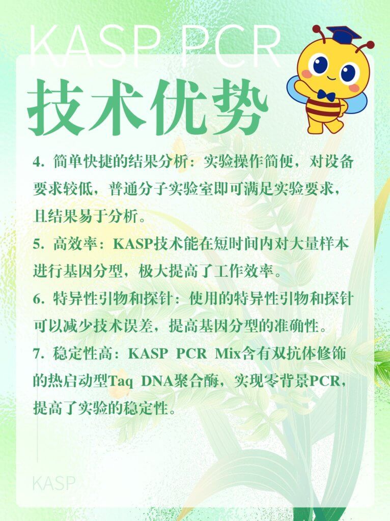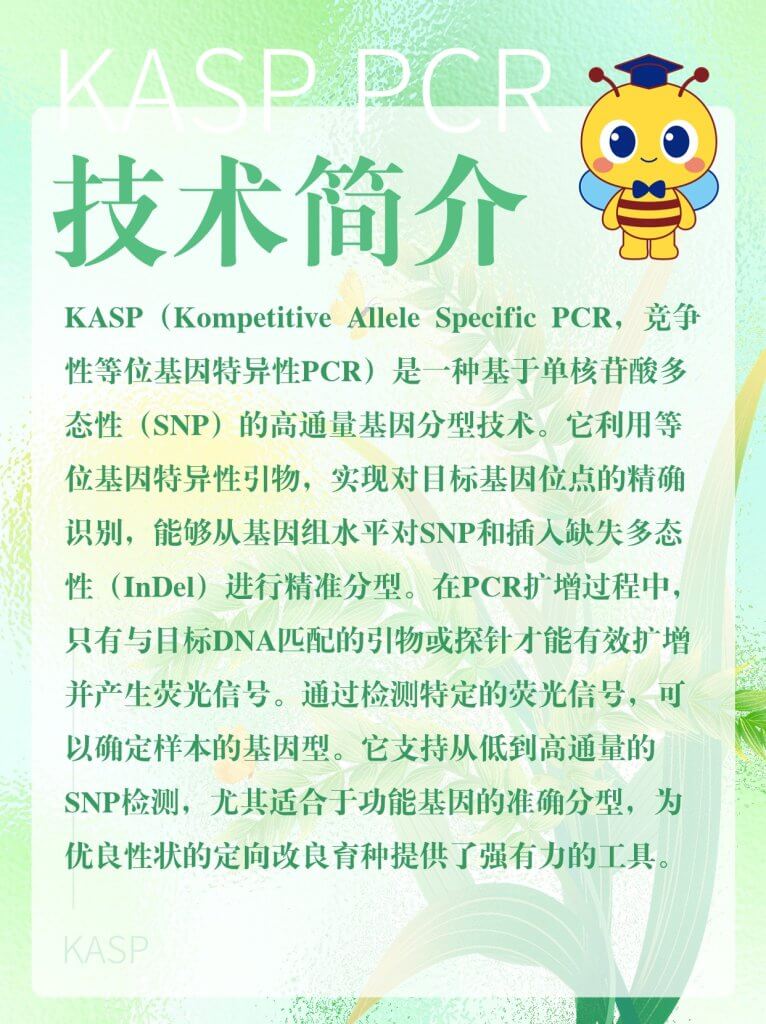 KASP(Kompetitive Allele-Specific PCR,競爭性(xing)(xing)等位(wei)(wei)基因(yin)特異性(xing)(xing) PCR)是一(yi)種用(yong)于基因(yin)分型的(de)技術,基于等位(wei)(wei)基因(yin)特異性(xing)(xing)PCR。它(ta)使用(yong)一(yi)種獨特的(de)競爭性(xing)(xing)PCR機制,能夠檢(jian)測特定(ding)位(wei)(wei)點(dian)的(de)單核苷酸多(duo)態(tai)性(xing)(xing)(SNP)和(he)插入/缺(que)失(InDels),具(ju)有通量高、成本低(di)和(he)可操作(zuo)性(xing)(xing)強等優點(dian),在(zai)農作(zuo)物性(xing)(xing)狀(zhuang)遺傳和(he)改良研究等領域具(ju)有廣(guang)泛的(de)應用(yong)。