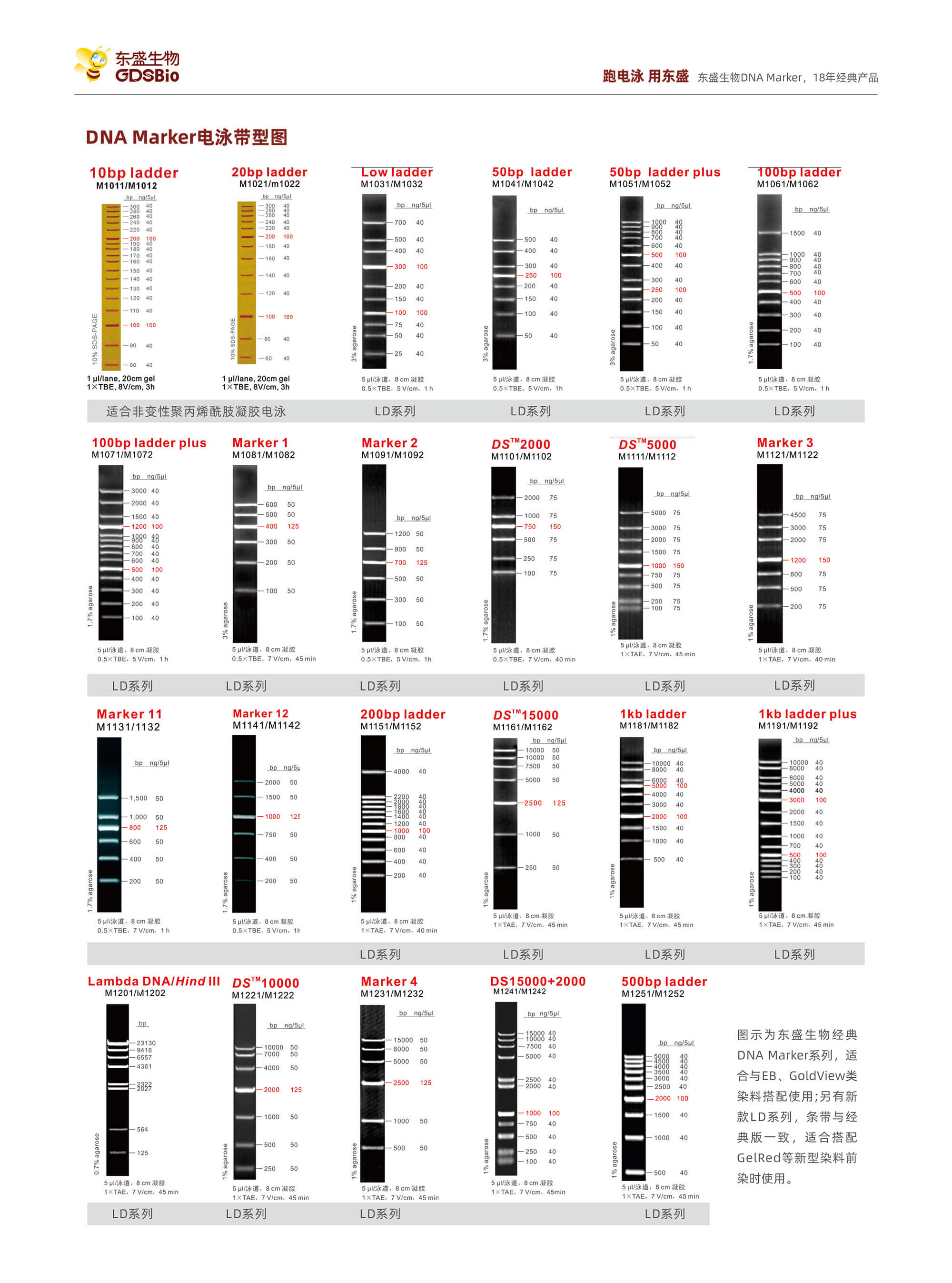 ?? 東盛生物提供?高質量 DNA Marker、核酸染料、電泳緩沖液、上樣緩沖液、瓊脂糖等試劑,助力科研人(ren)員高(gao)效(xiao)、穩定地完成核酸(suan)電泳工作。