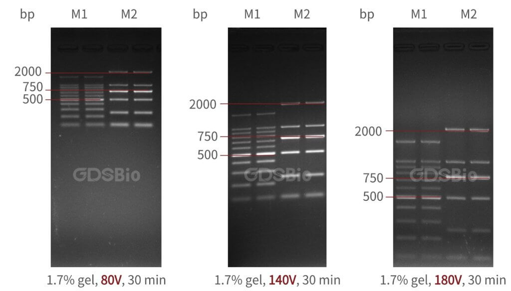 小片段 DNA 分離(幾十到幾百 bp):可稍高電壓(8–10 V/cm)。